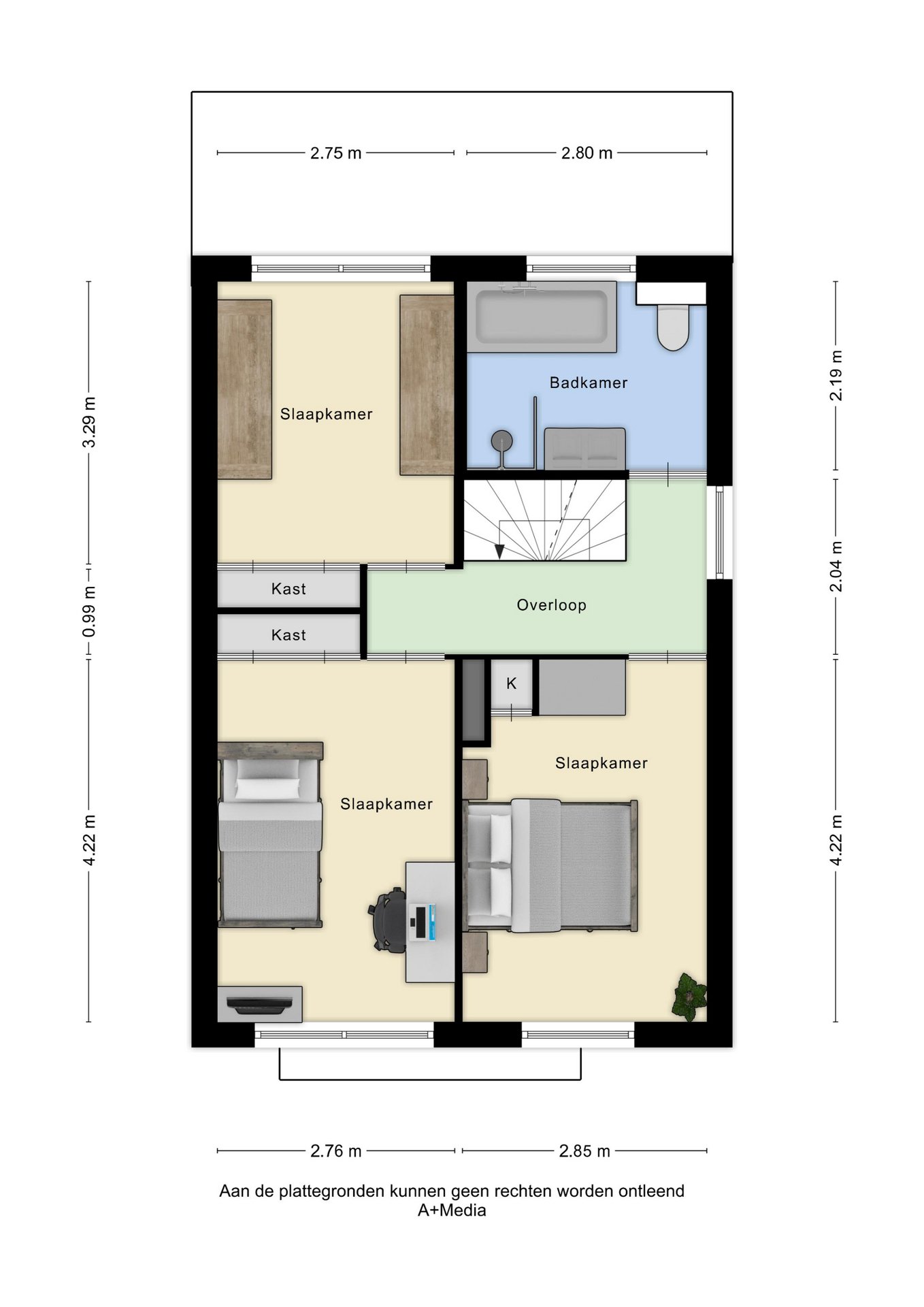 Via de vaste trap bereik je de overloop op de eerste verdieping. Vanaf hier is er toegang tot drie slaapkamers en de badkamer. De slaapkamers zijn stuk voor stuk prettig van formaat en flexibel in te richten als slaap-, werk- of kastenkamer. Dankzij de goede indeling is deze verdieping praktisch en comfortabel in gebruik.