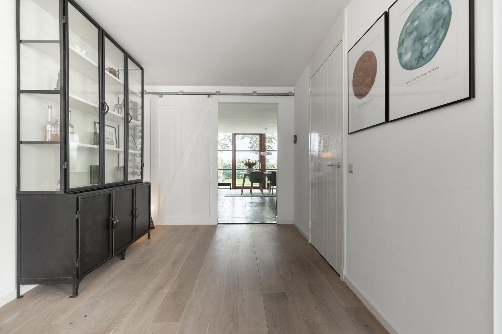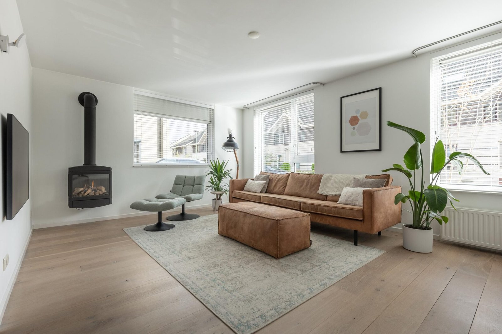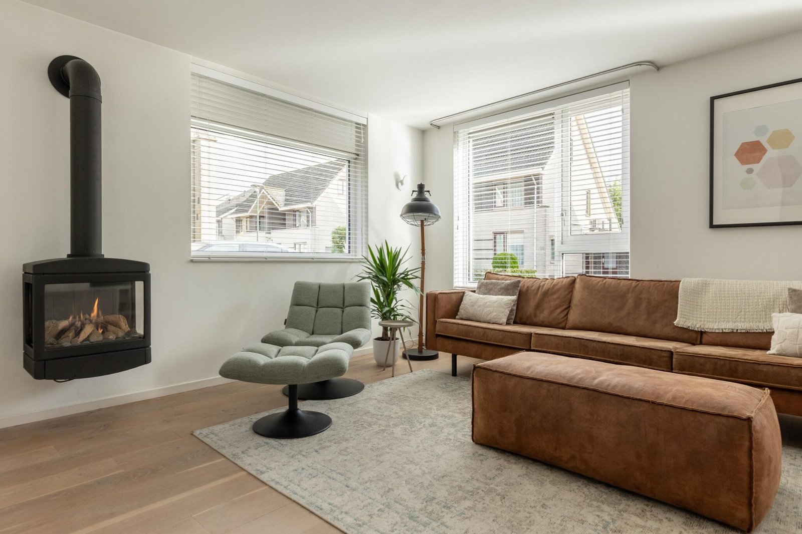 Via de overdekte entree kom je in de ruime hal met garderobe, meterkast, toilet en open trap naar de eerste verdieping. Vanuit hier stap je de lichte woonkamer binnen. De L-vormige woonkamer heeft een warme uitstraling dankzij de lichte eiken houten vloer en de sfeervolle gashaard. De grote ramen zorgen voor veel daglicht en een prettige verbinding