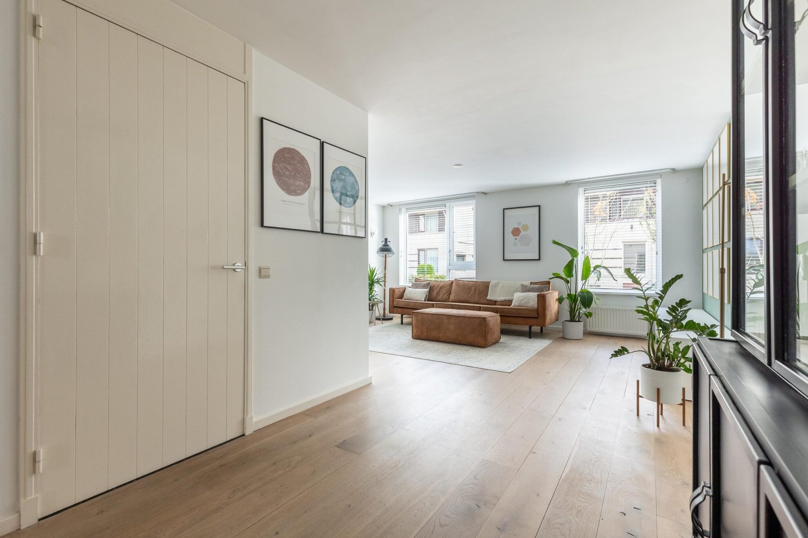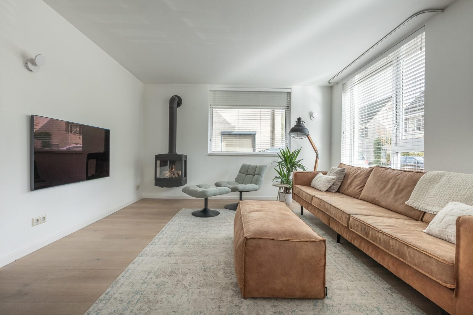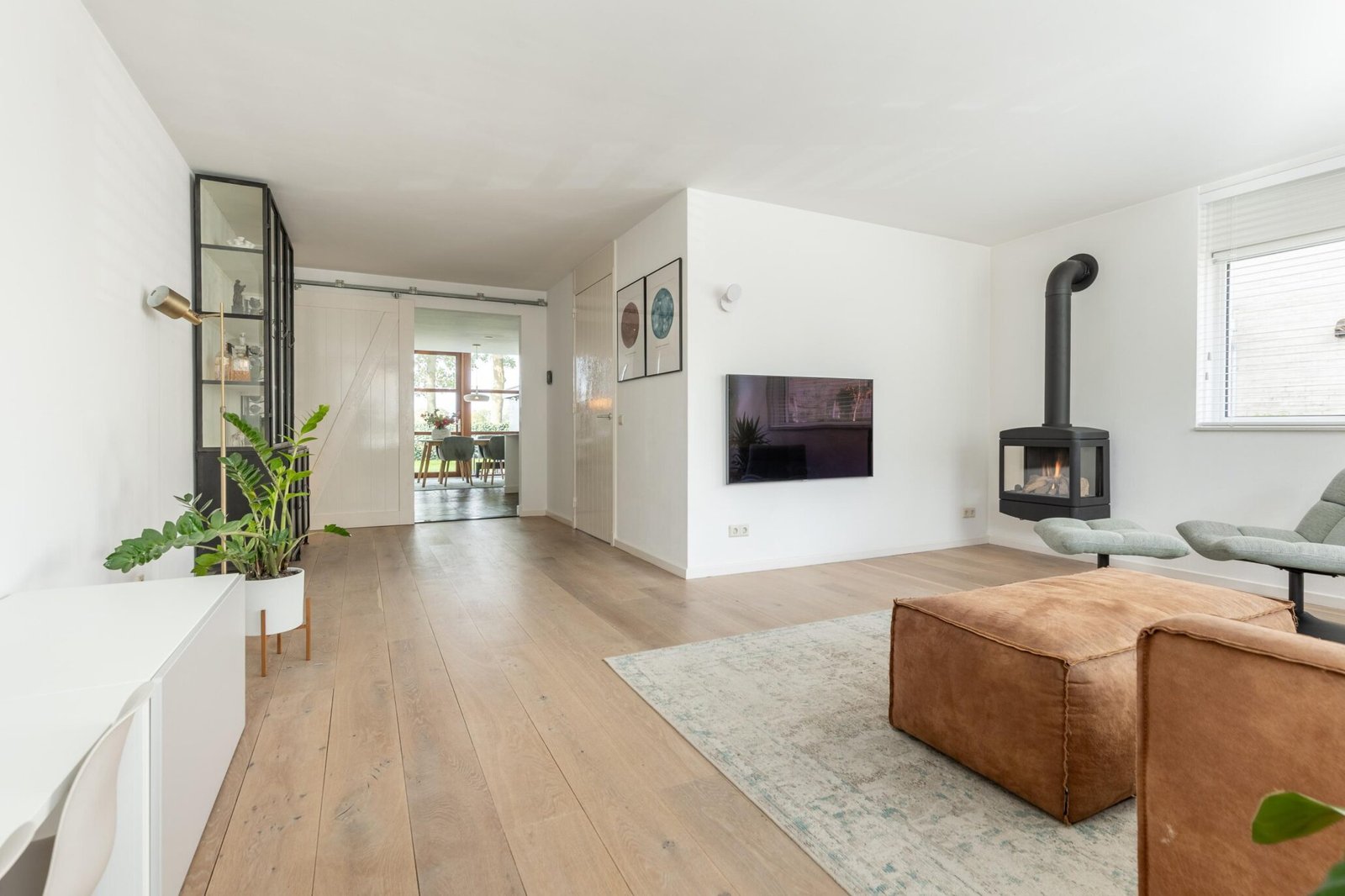 Via de overdekte entree kom je in de ruime hal met garderobe, meterkast, toilet en open trap naar de eerste verdieping. Vanuit hier stap je de lichte woonkamer binnen. De L-vormige woonkamer heeft een warme uitstraling dankzij de lichte eiken houten vloer en de sfeervolle gashaard. De grote ramen zorgen voor veel daglicht en een prettige verbinding