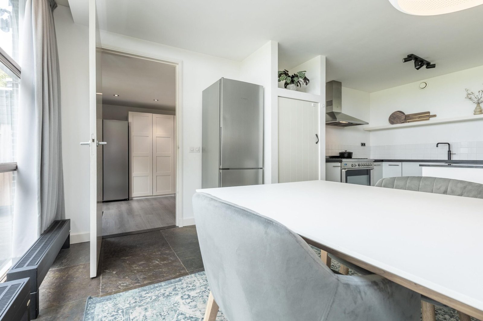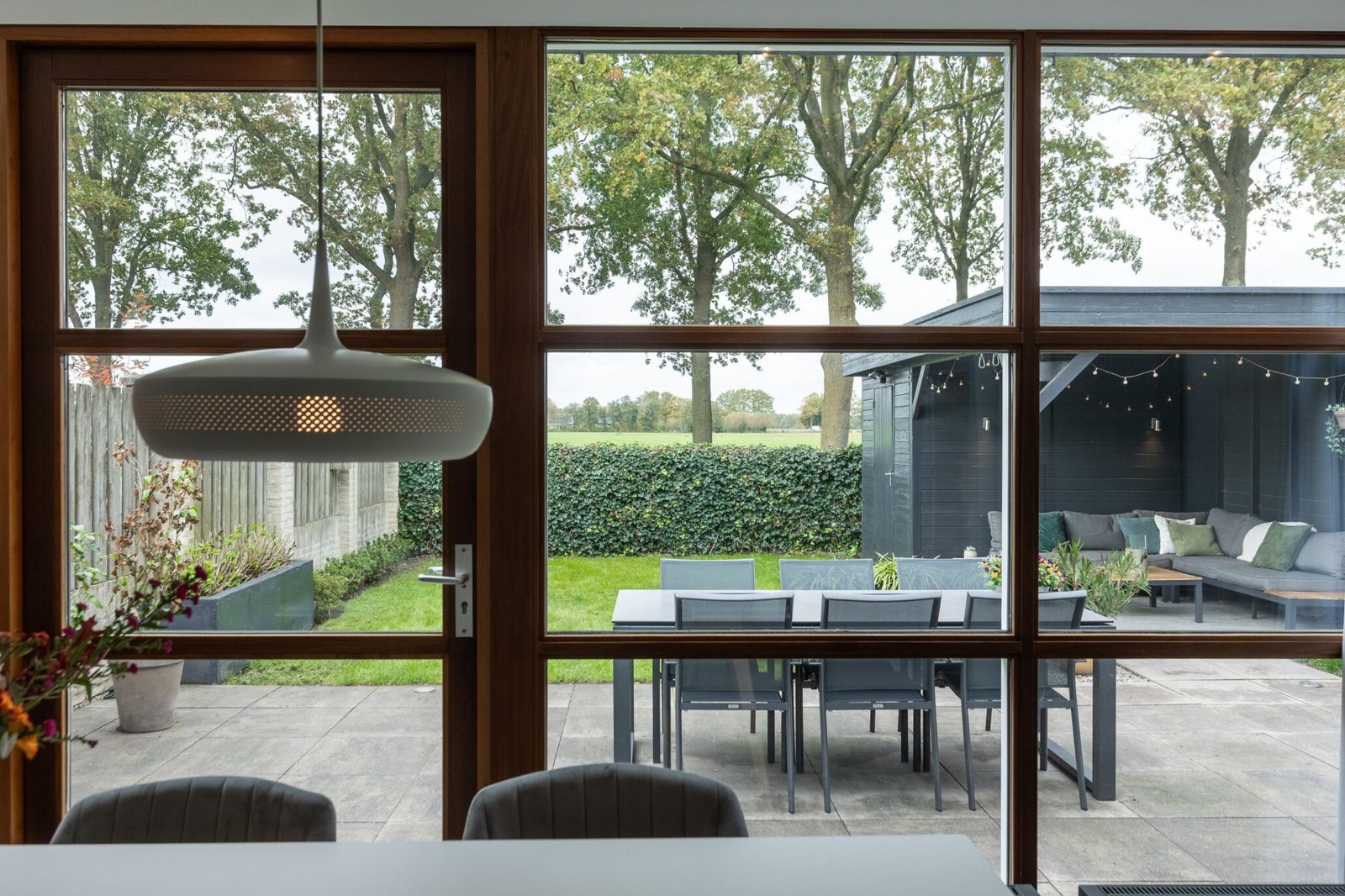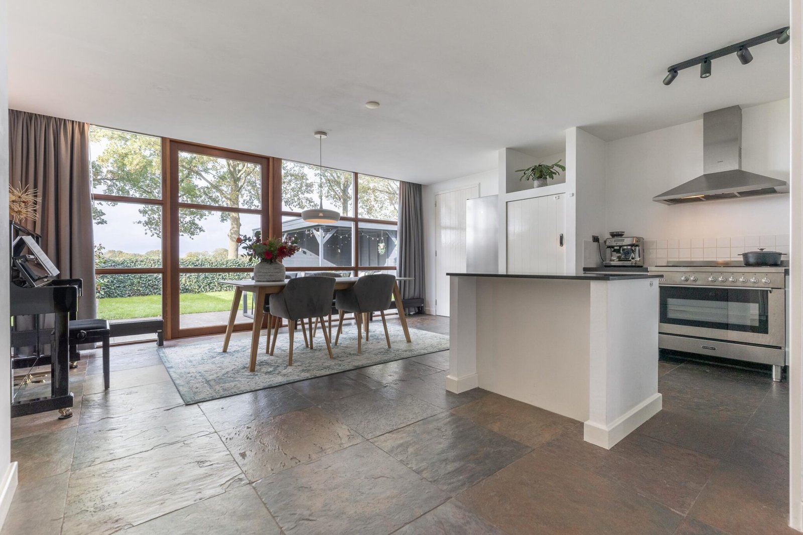 met buiten. Aan de achterzijde is in 2004 een royale aanbouw van ruim 3 meter geplaatst, waardoor een ruime woonkeuken is ontstaan. Deze vormt het hart van het huis en biedt volop plaats voor een grote eettafel met uitzicht op de tuin en de achterliggende landerijen. De keuken is afgewerkt met een granieten werkblad en beschikt over een 6-pits