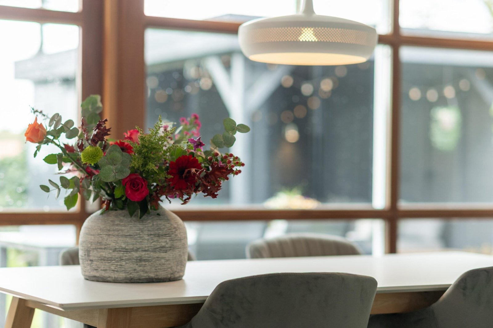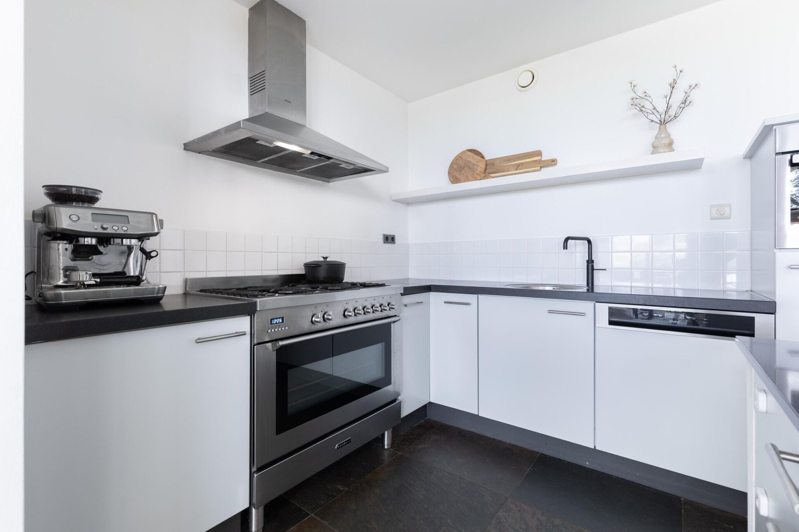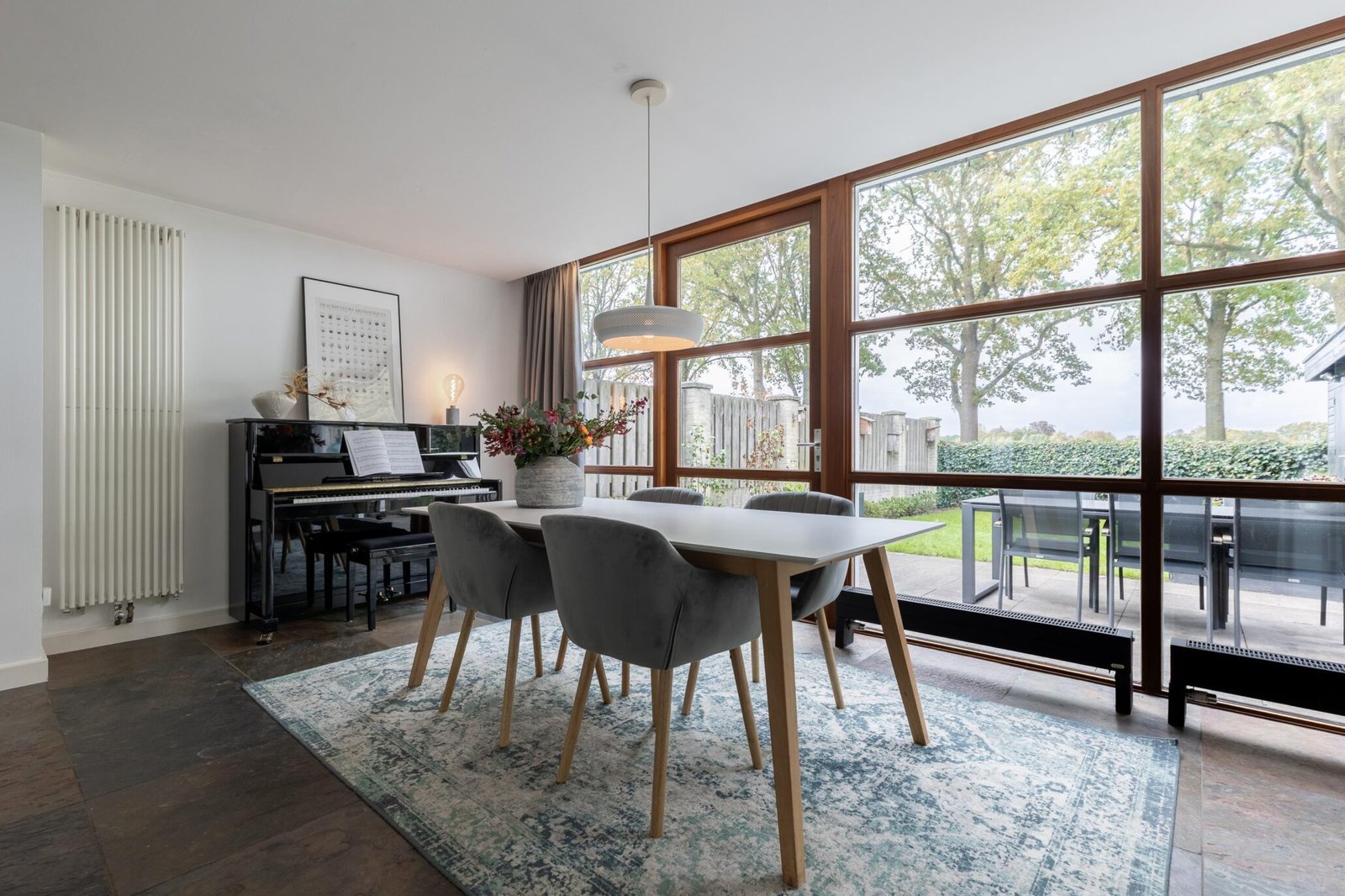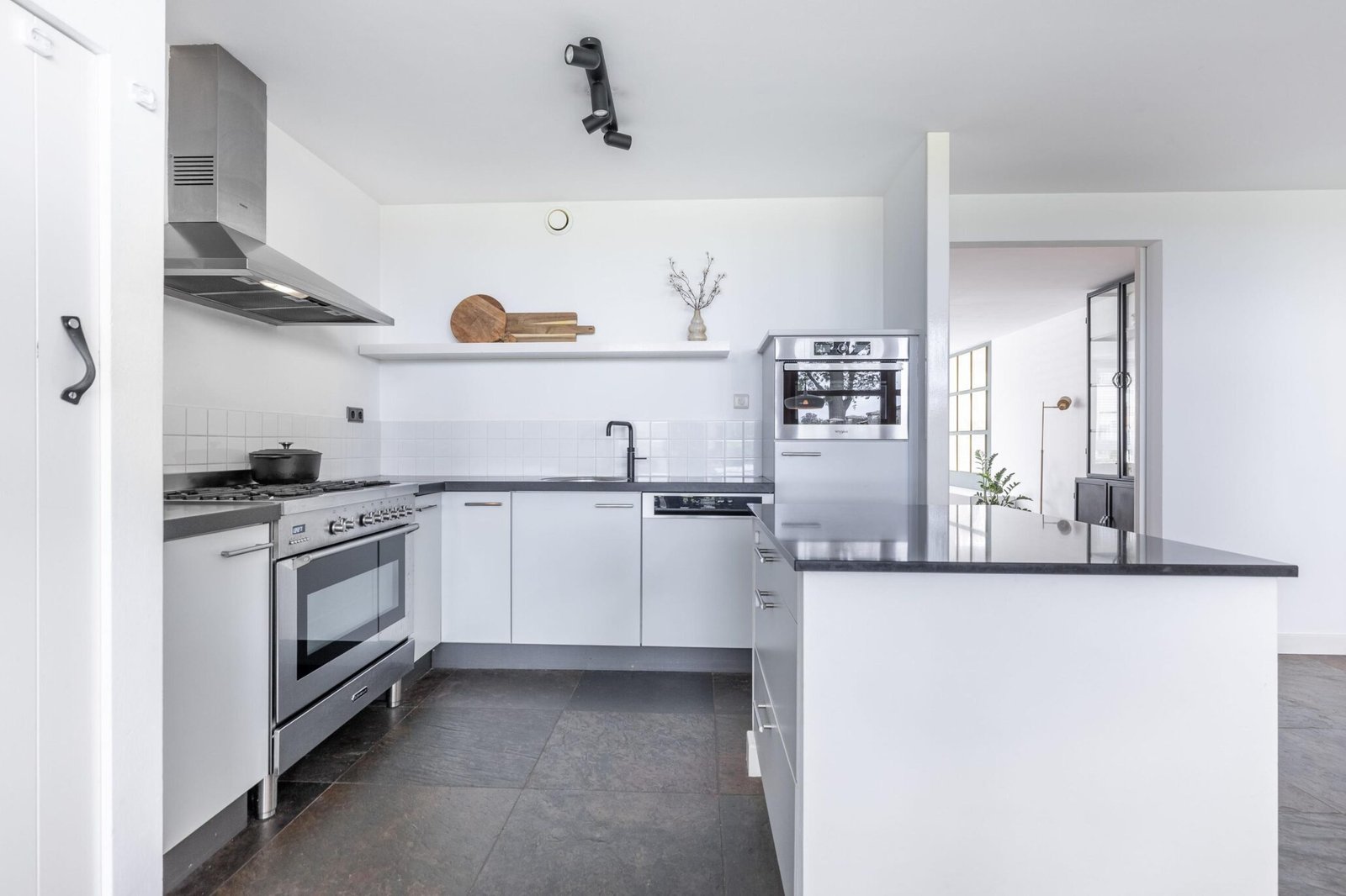 met buiten. Aan de achterzijde is in 2004 een royale aanbouw van ruim 3 meter geplaatst, waardoor een ruime woonkeuken is ontstaan. Deze vormt het hart van het huis en biedt volop plaats voor een grote eettafel met uitzicht op de tuin en de achterliggende landerijen. De keuken is afgewerkt met een granieten werkblad en beschikt over een 6-pits
