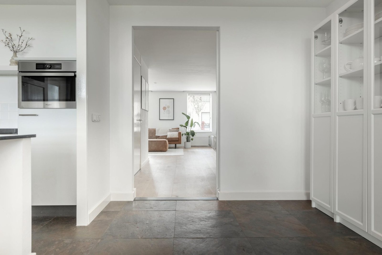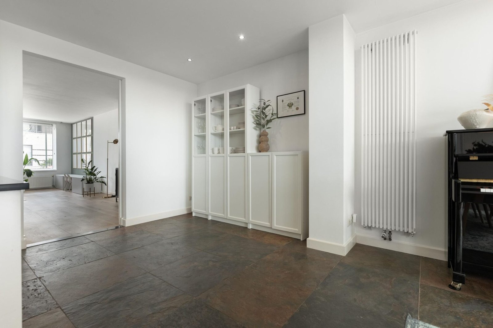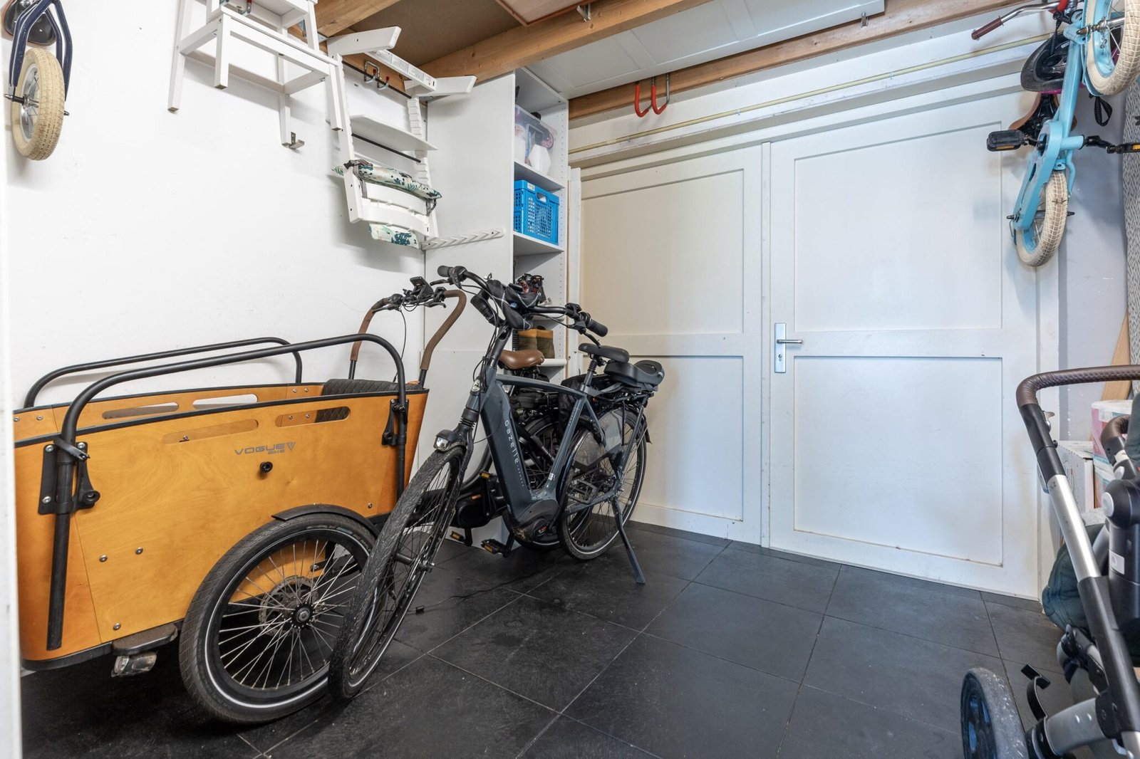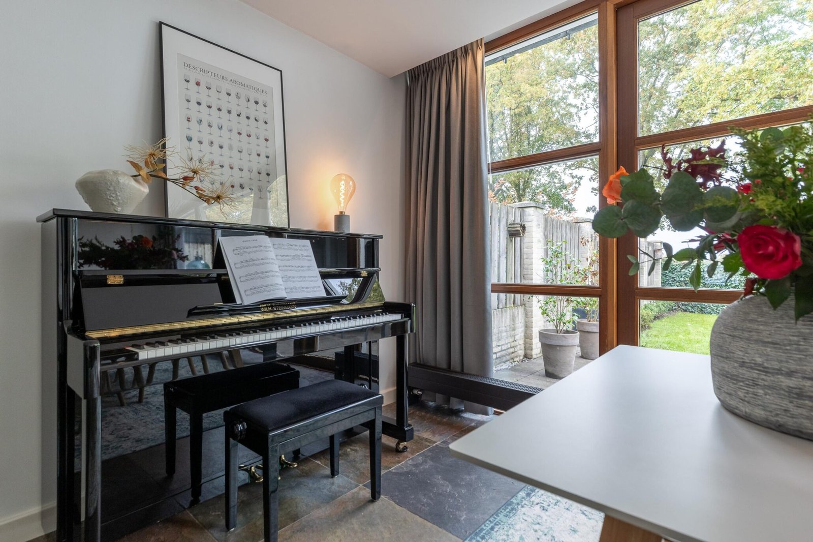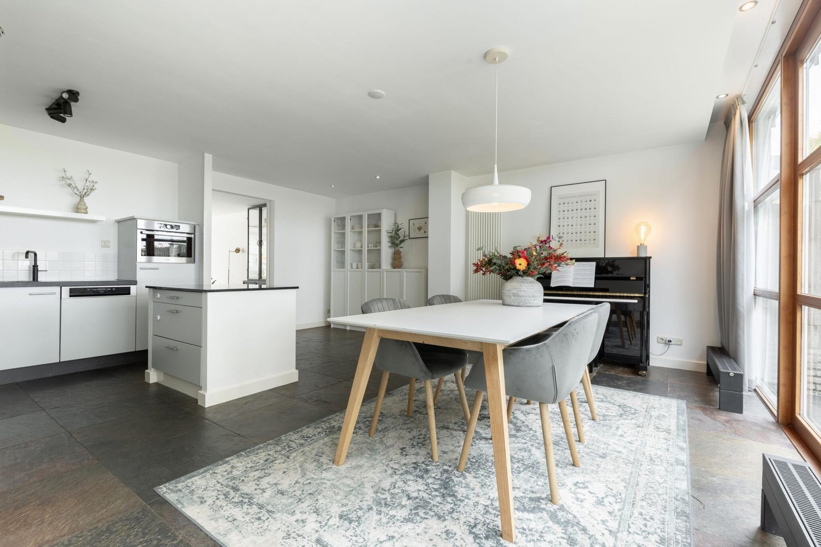 fornuis met oven, combi-oven, vaatwasser, koelvriescombinatie, Quooker Fusion kraan en veel kastruimte. De Chinese leisteenvloer is niet alleen stijlvol, maar ook praktisch in onderhoud. De woonkamer en keuken kunnen van elkaar afgesloten worden door middel van een loftdeur. Vanuit de keuken is er toegang tot een aangrenzende speel- of werkruimte en de fietsenberging. De omvormer van de 12 zonnepanelen bevindt zich in deze berging. De begane grond is tot in detail afgewerkt en biedt veel leefruimte voor het hele gezin.