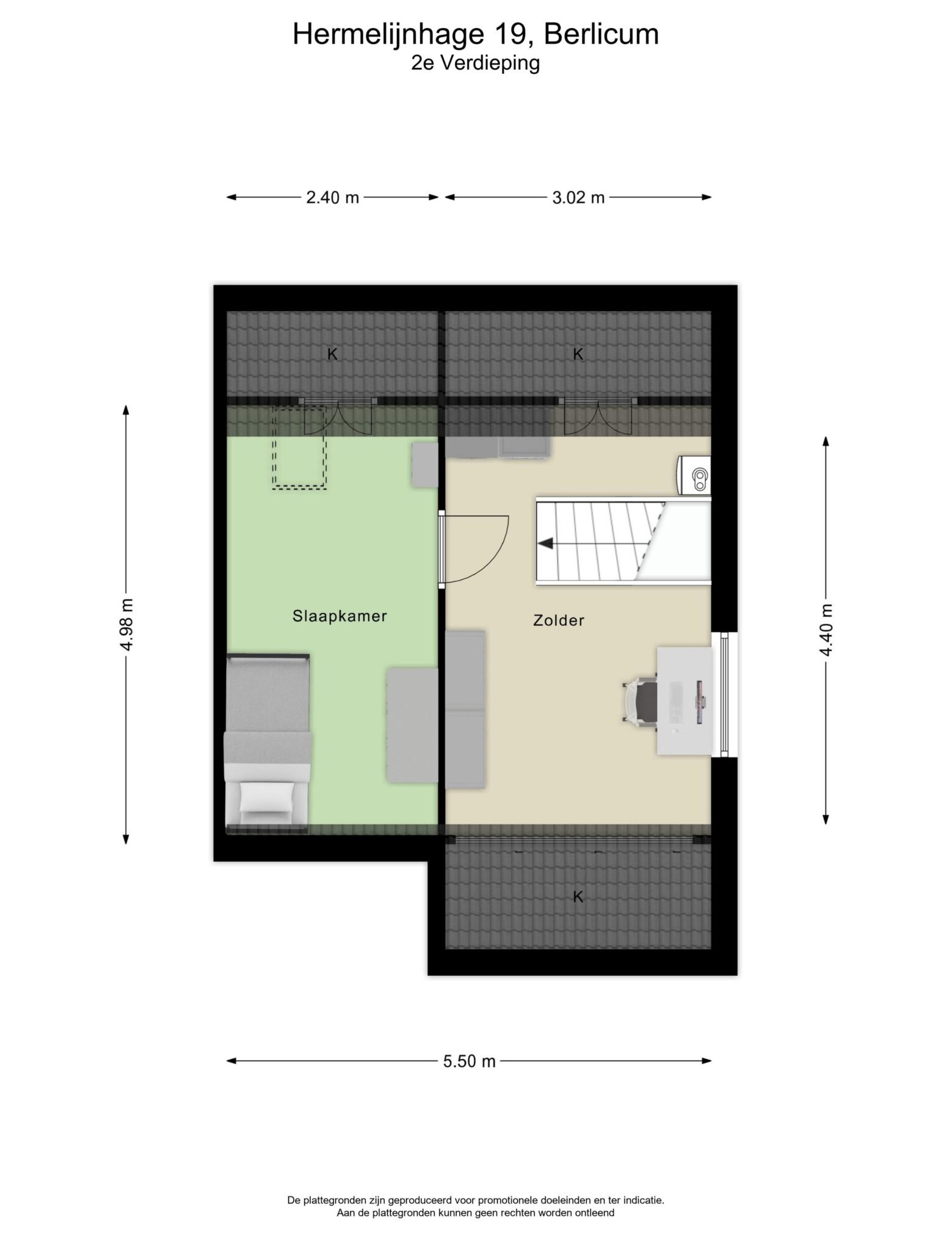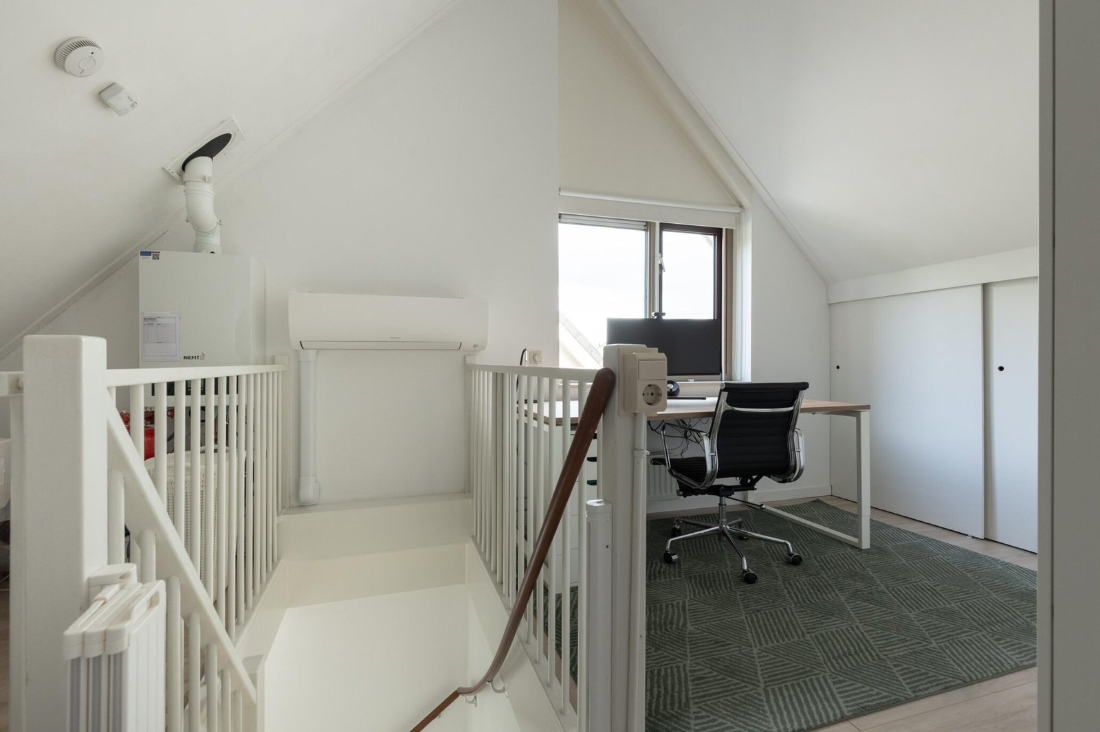 Op de tweede verdieping bevindt zich een ruime voorzolder, nu in gebruik als werkkamer. Hier kan eventueel een vijfde slaapkamer gerealiseerd worden. De voorzolder is voorzien van een airconditioning, bergruimte achter de knieschotten,