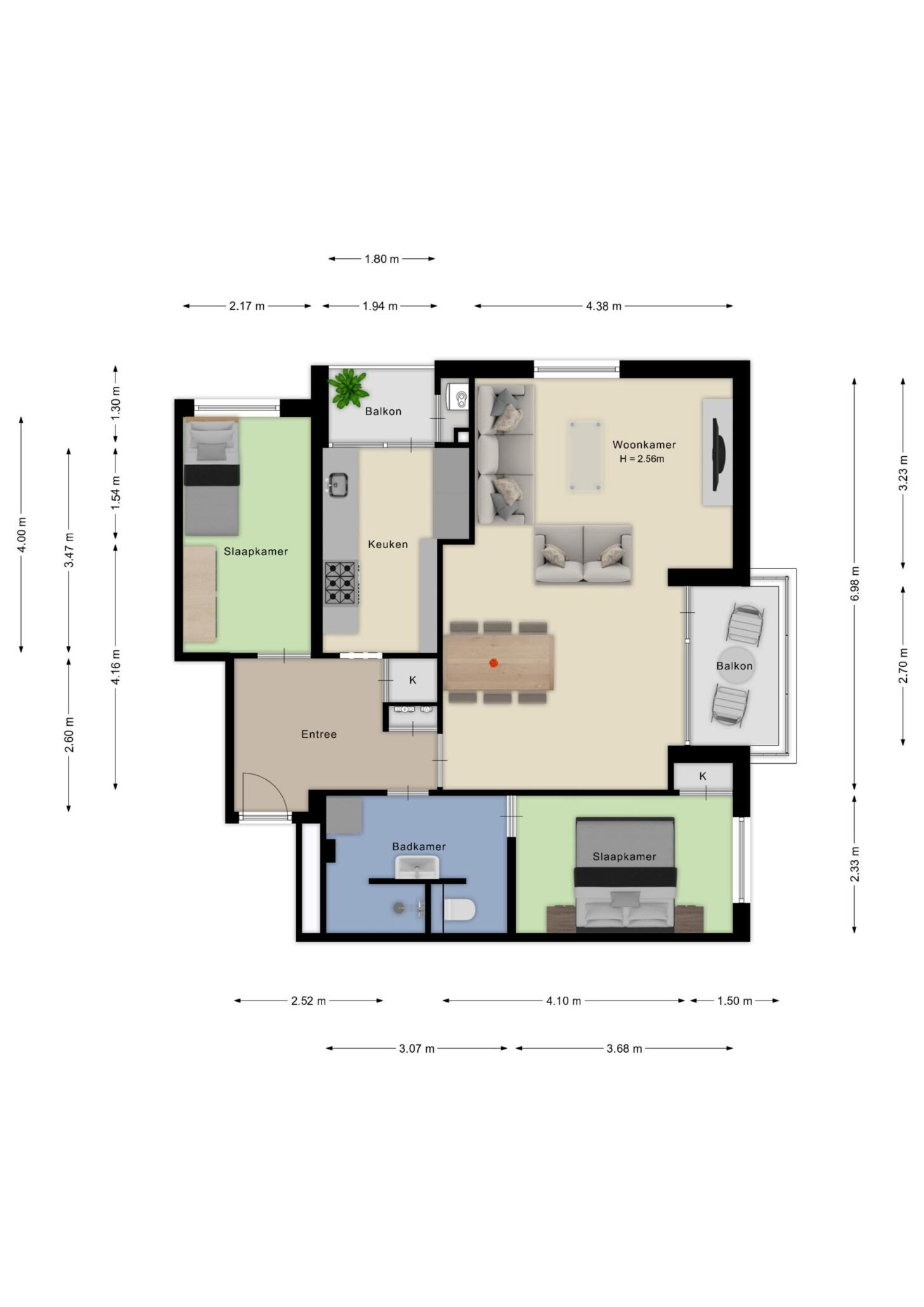 In de hal tref je de videofoon, meterkast en een praktische bergkast aan. Vanuit deze hal heb je toegang tot de woonkamer, keuken, badkamer en één van de slaapkamers.