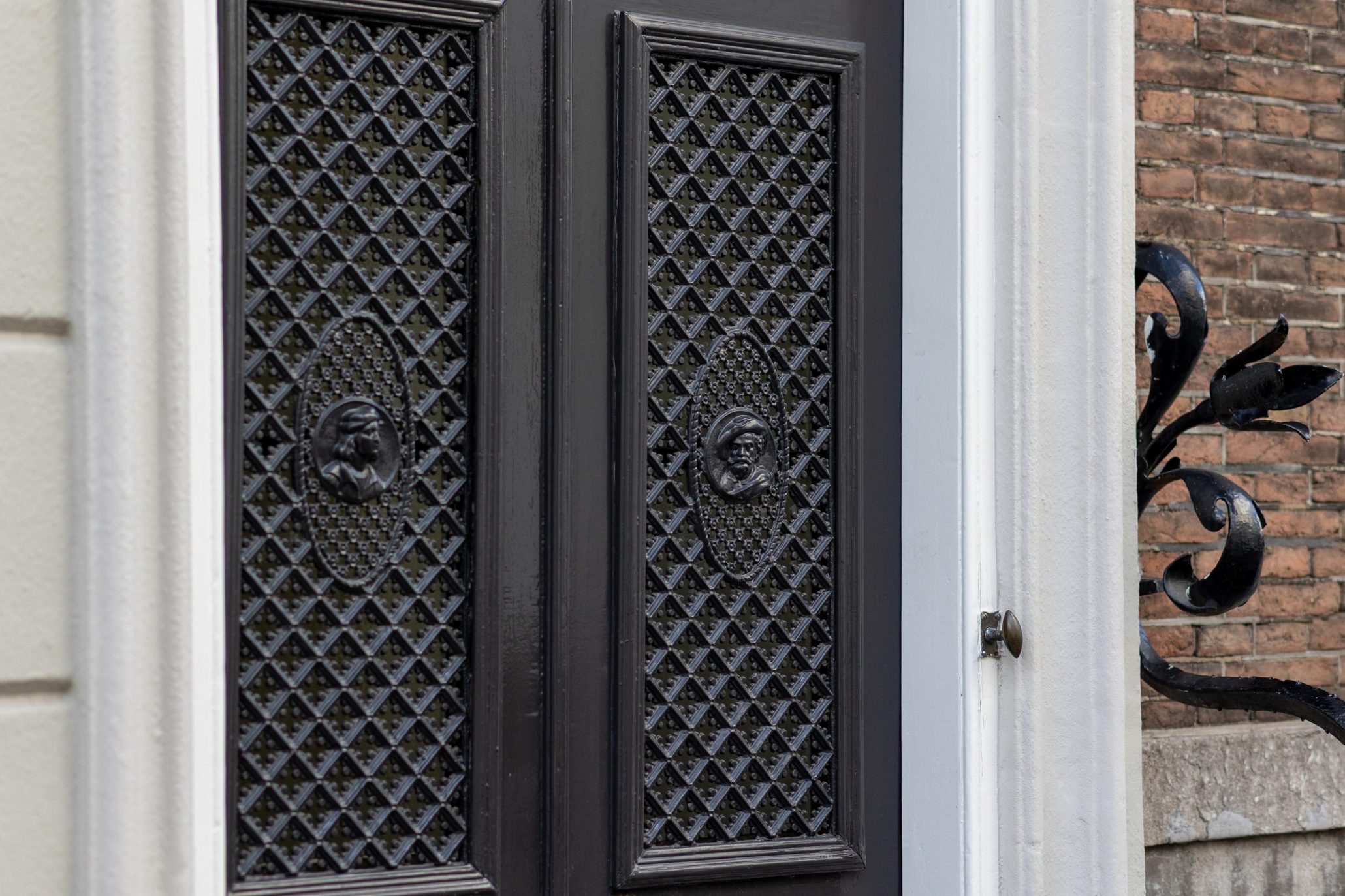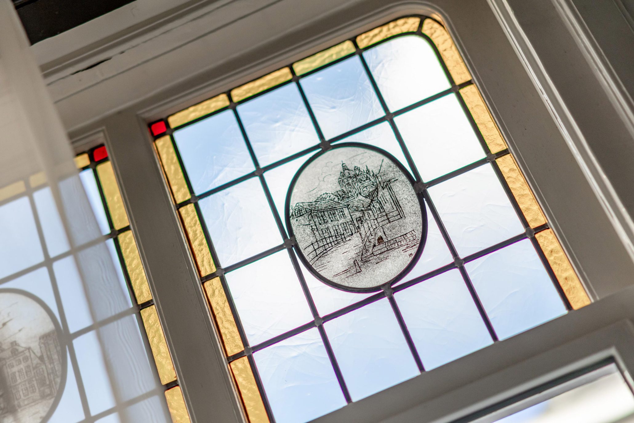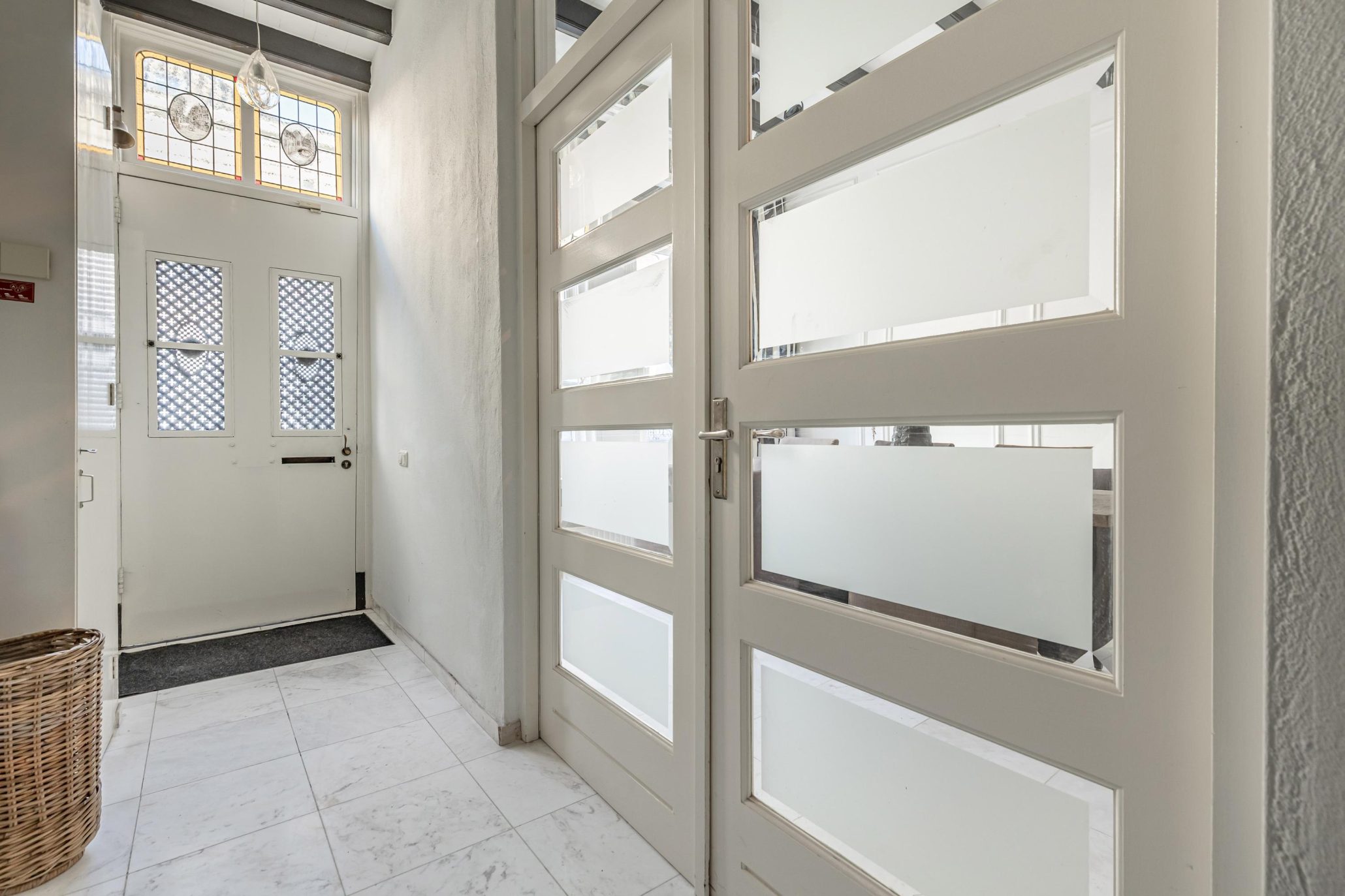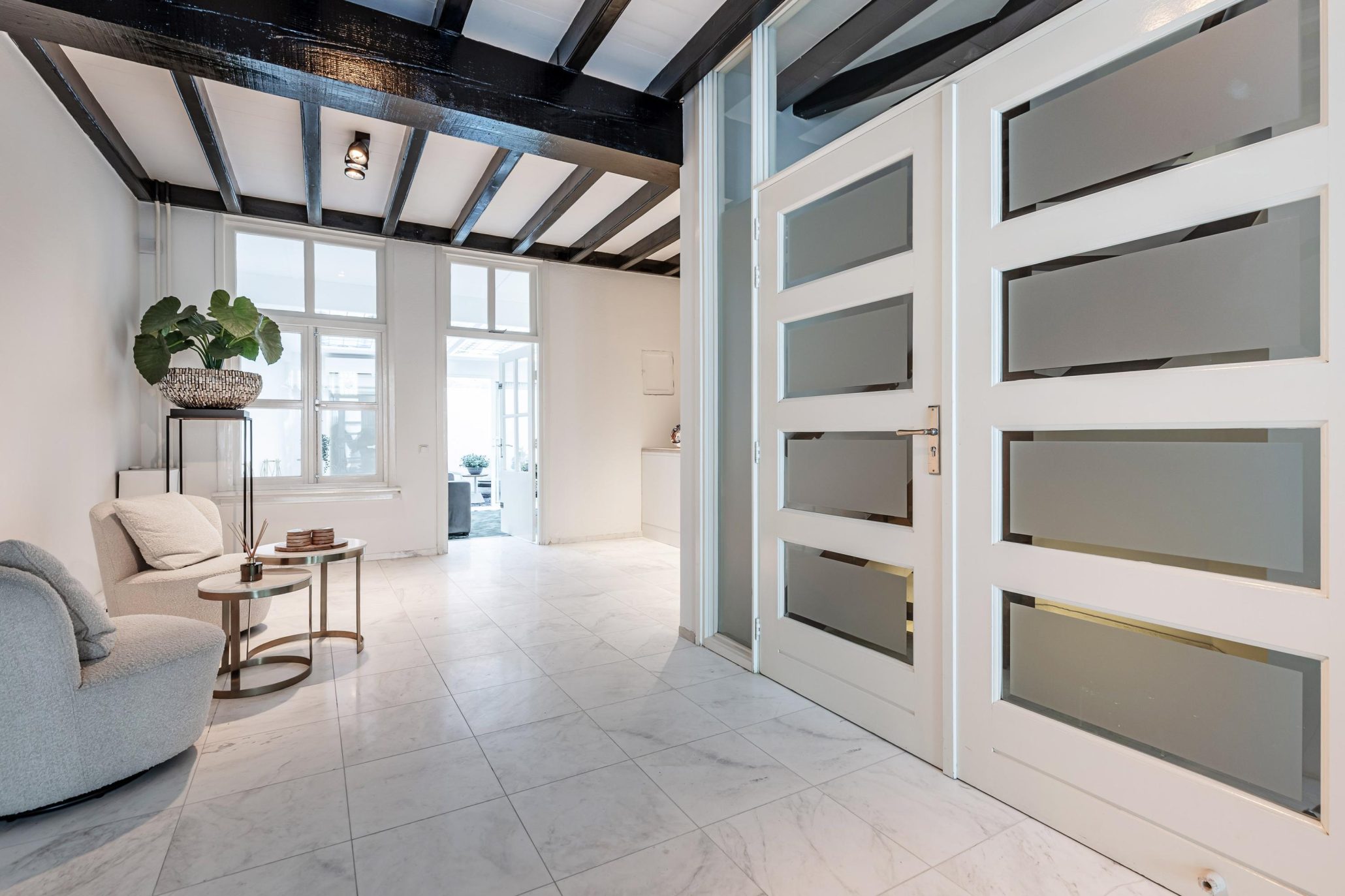 Zodra je de fraaie voordeur opent, betreed je een statige hal met marmeren vloer met glasdeuren. Het glas-in-lood in de bovenlichten aan de voorzijde vangt het daglicht en brengt meteen warmte in de ruimte. Via de dubbele deuren loop je naar de woonkamer aan de straatzijde: een sfeervolle plek met hoge ramen die uitzicht bieden op het levendige straatbeeld. Hier geniet je van het spel van licht en kleur dat de glas-in-loodramen creëren.