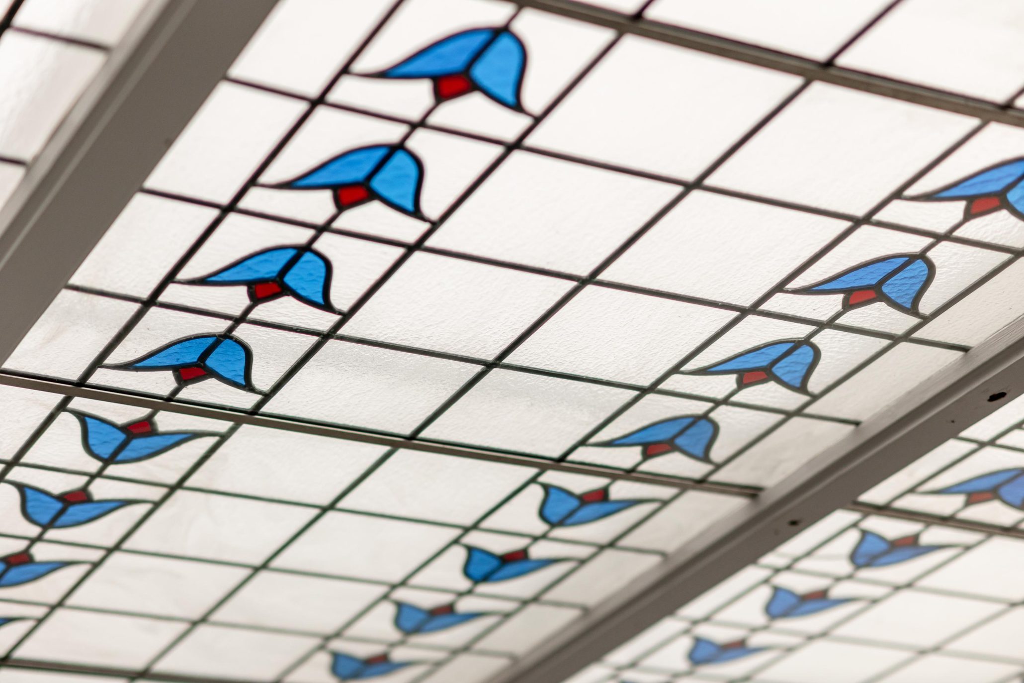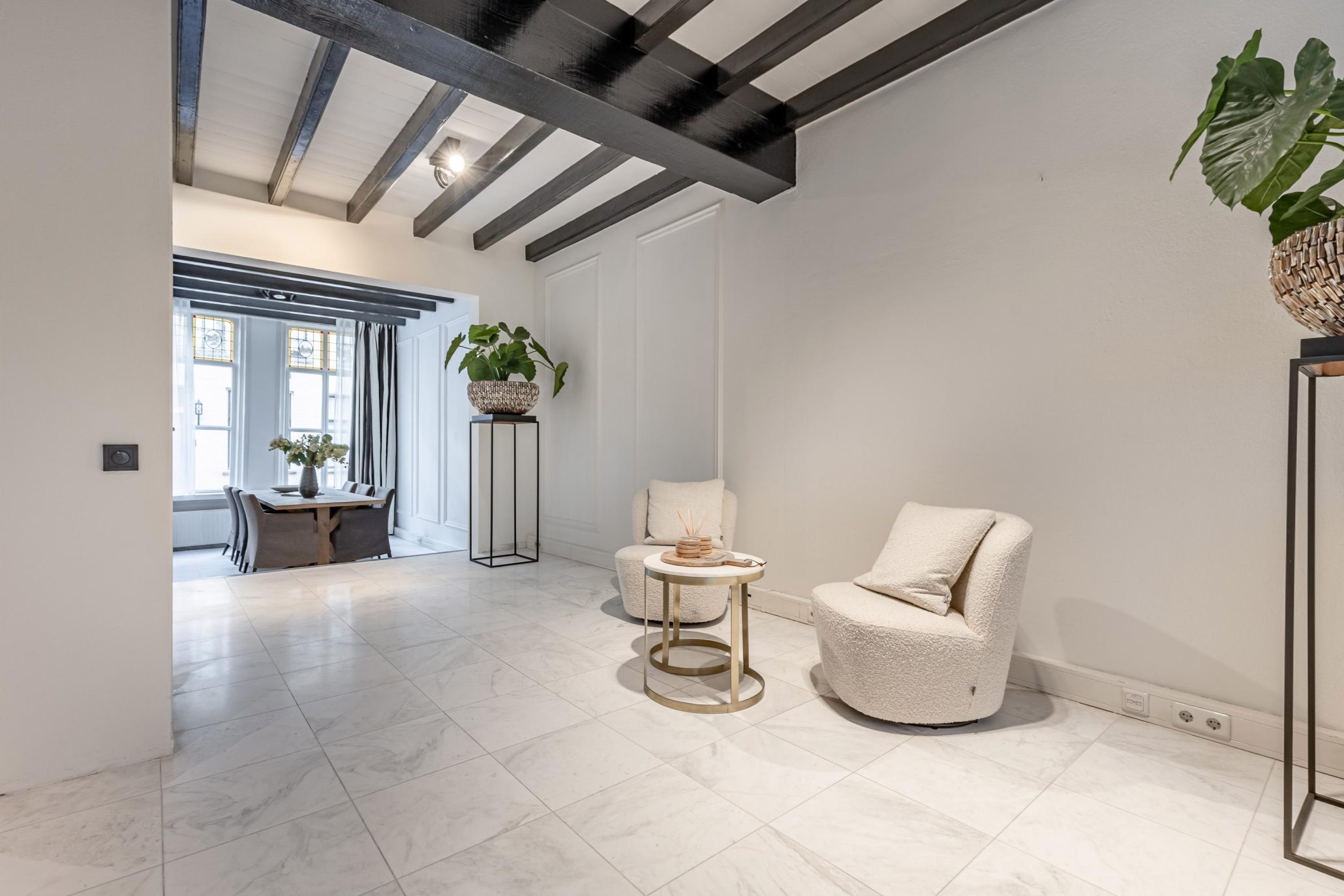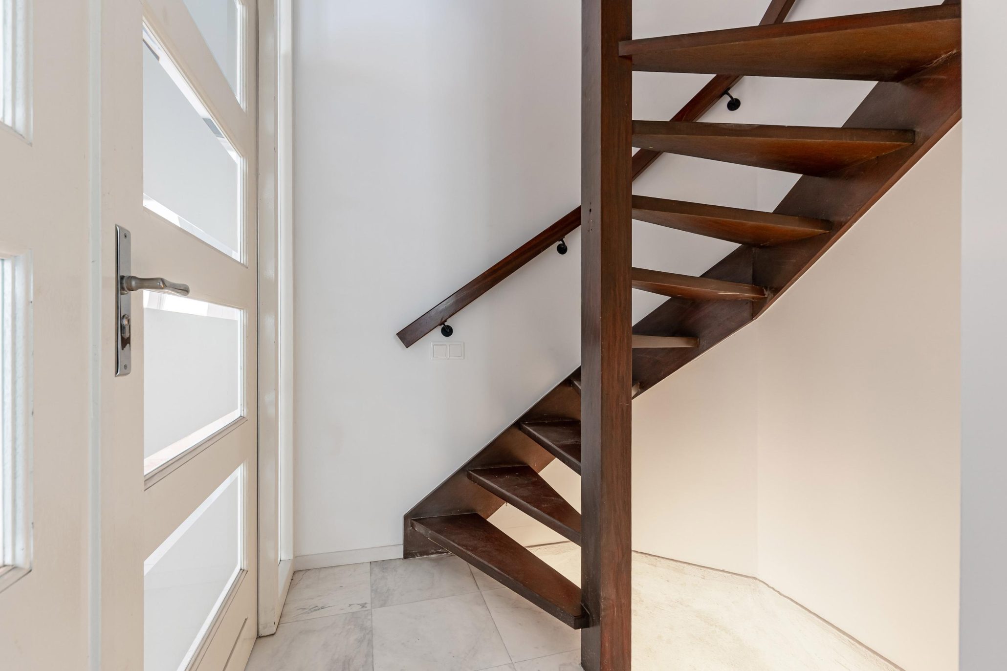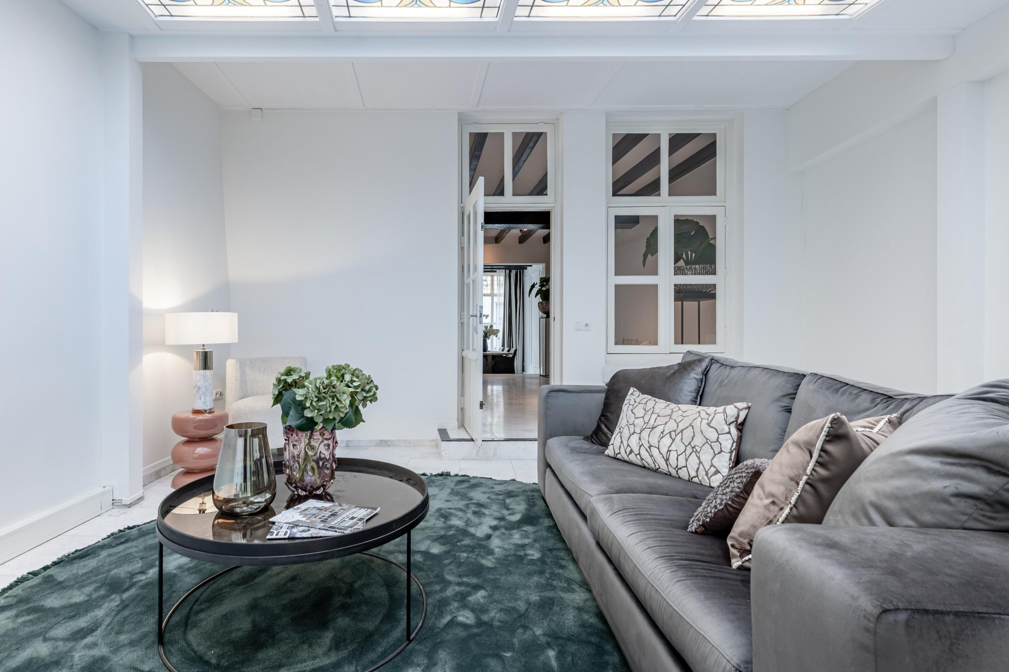 Zodra je de fraaie voordeur opent, betreed je een statige hal met marmeren vloer met glasdeuren. Het glas-in-lood in de bovenlichten aan de voorzijde vangt het daglicht en brengt meteen warmte in de ruimte. Via de dubbele deuren loop je naar de woonkamer aan de straatzijde: een sfeervolle plek met hoge ramen die uitzicht bieden op het levendige straatbeeld. Hier geniet je van het spel van licht en kleur dat de glas-in-loodramen creëren.