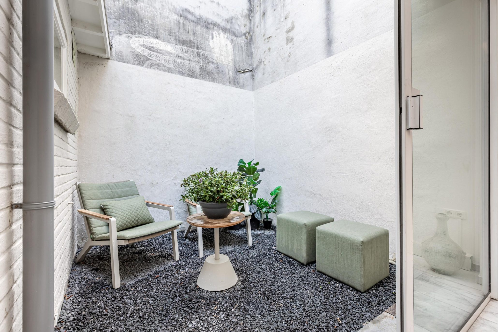 Via de serre bereik je de beschutte patio-tuin: een intieme buitenruimte waar je, omgeven door hoge muren, geniet van volledige privacy. De bestrating is onderhoudsvriendelijk en biedt ruimte voor een eettafel of loungeset. Dankzij de zuidwest ligging profiteer je verrassend genoeg nog van de zon, terwijl de stadse geluiden op de achtergrond vervagen. Een heerlijke plek voor een glas wijn in de avond of een rustige koffiepauze in de ochtend.