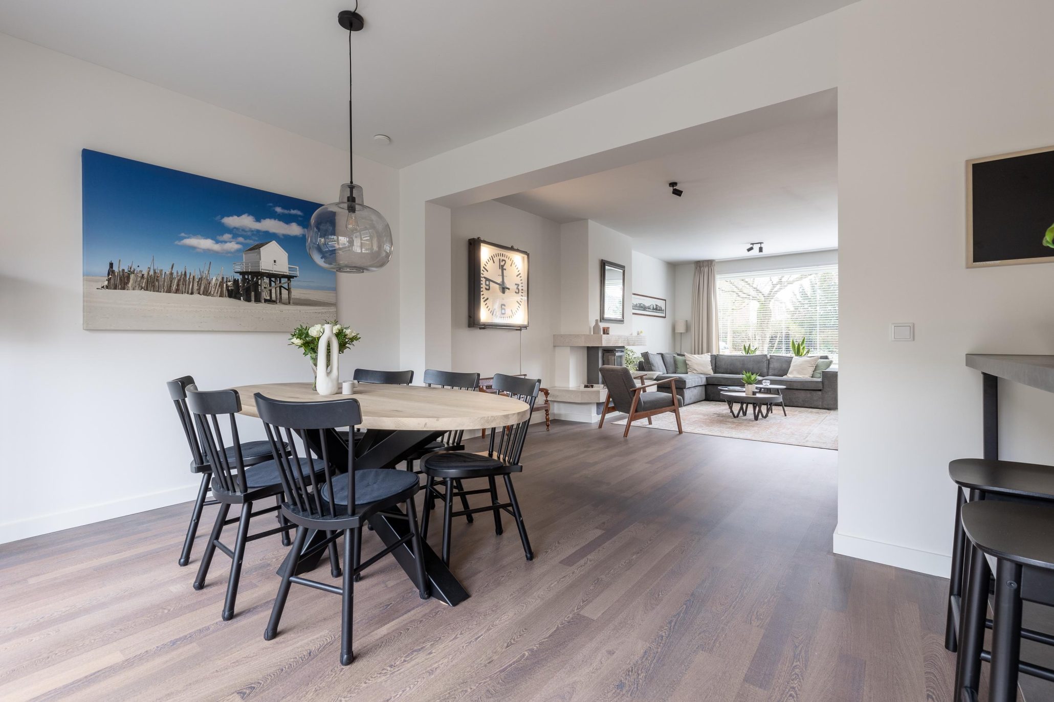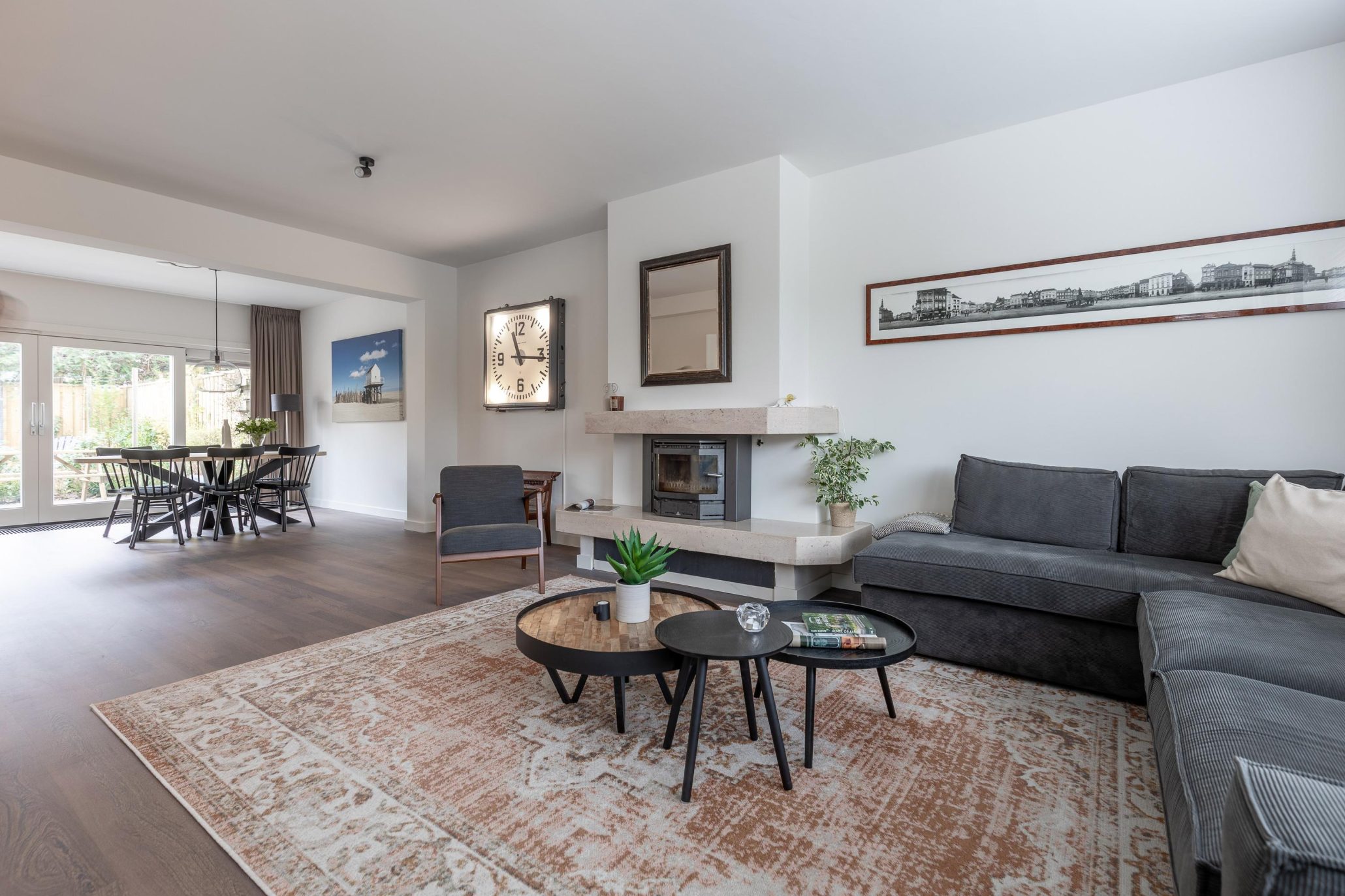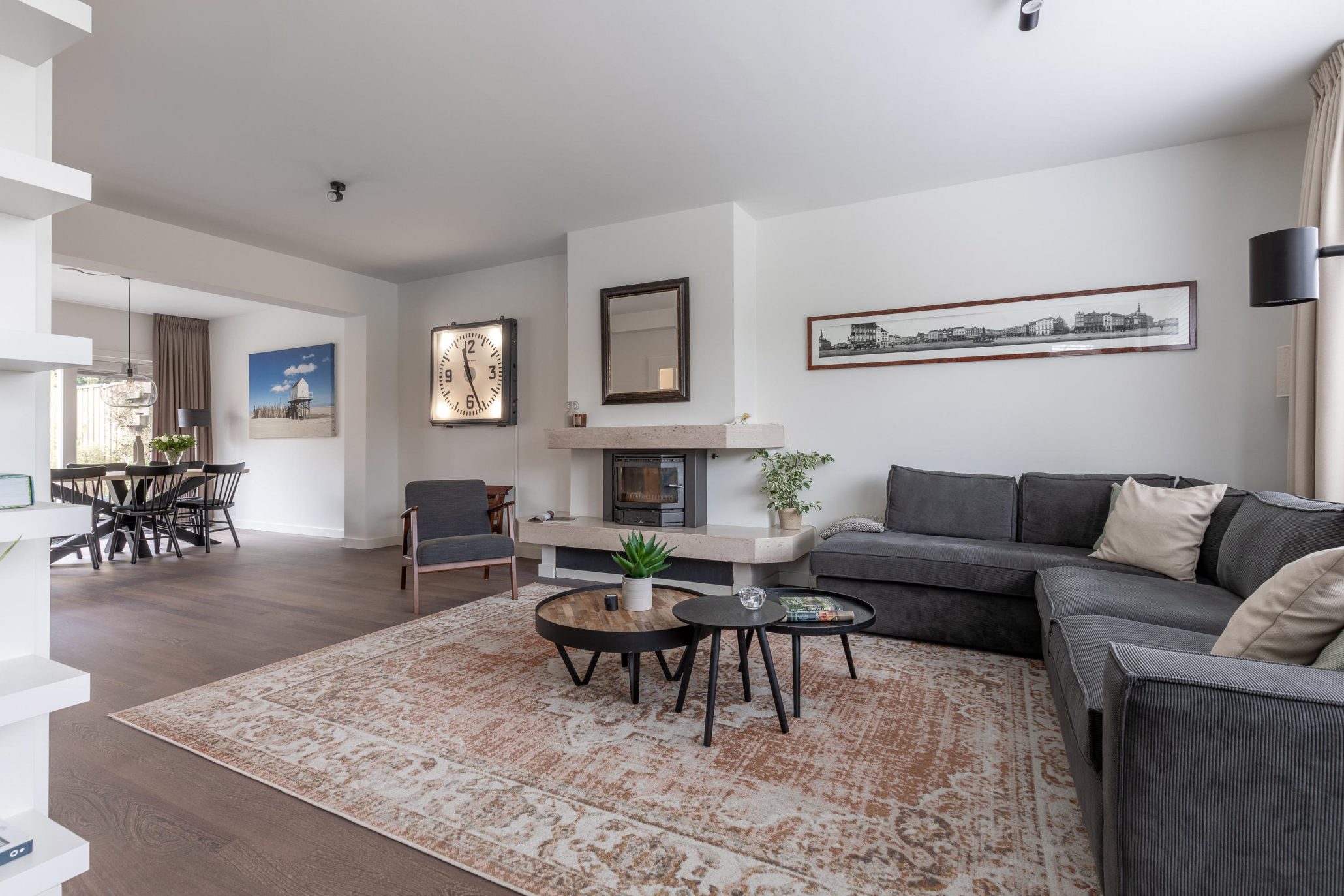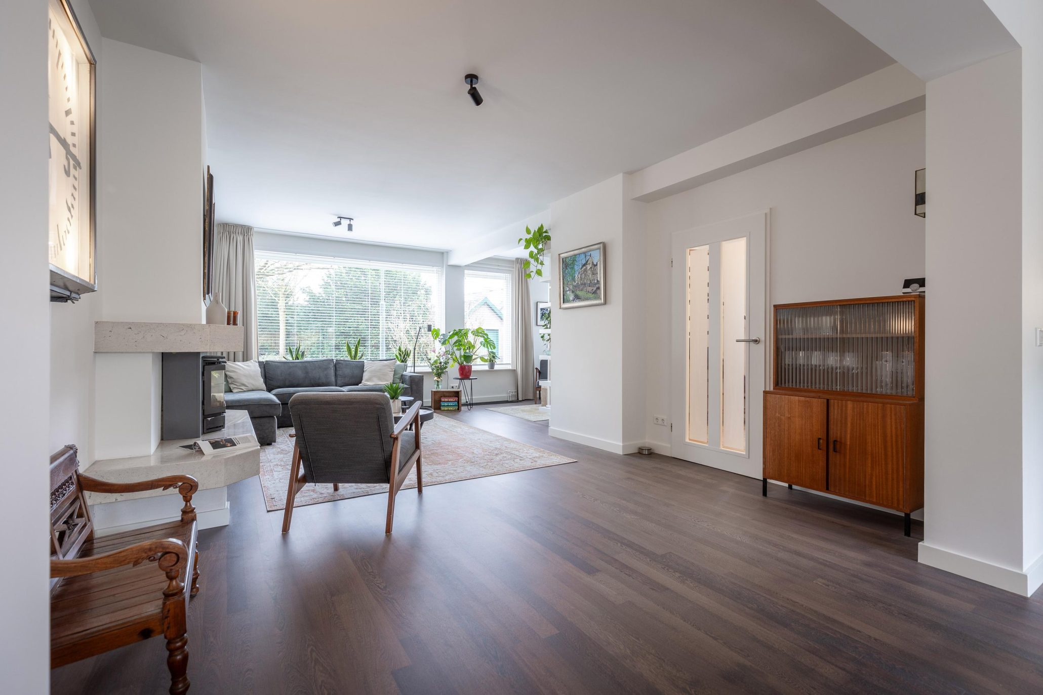 De ruime woonkamer is een heerlijke plek om te vertoeven. De sfeervolle houten parketvloer, de uitnodigende open haard en de strak gestuukte wanden zorgen samen voor een warme en elegante uitstraling. Dankzij de vele ramen
