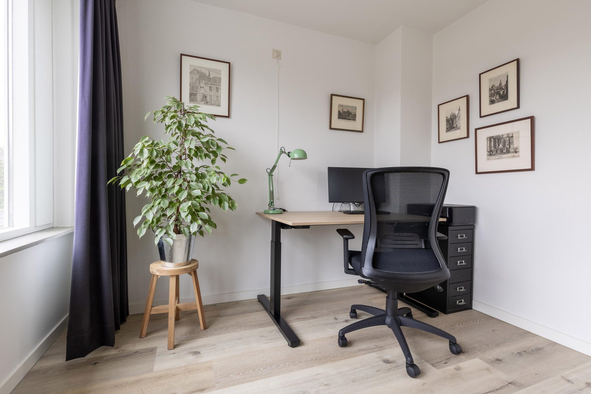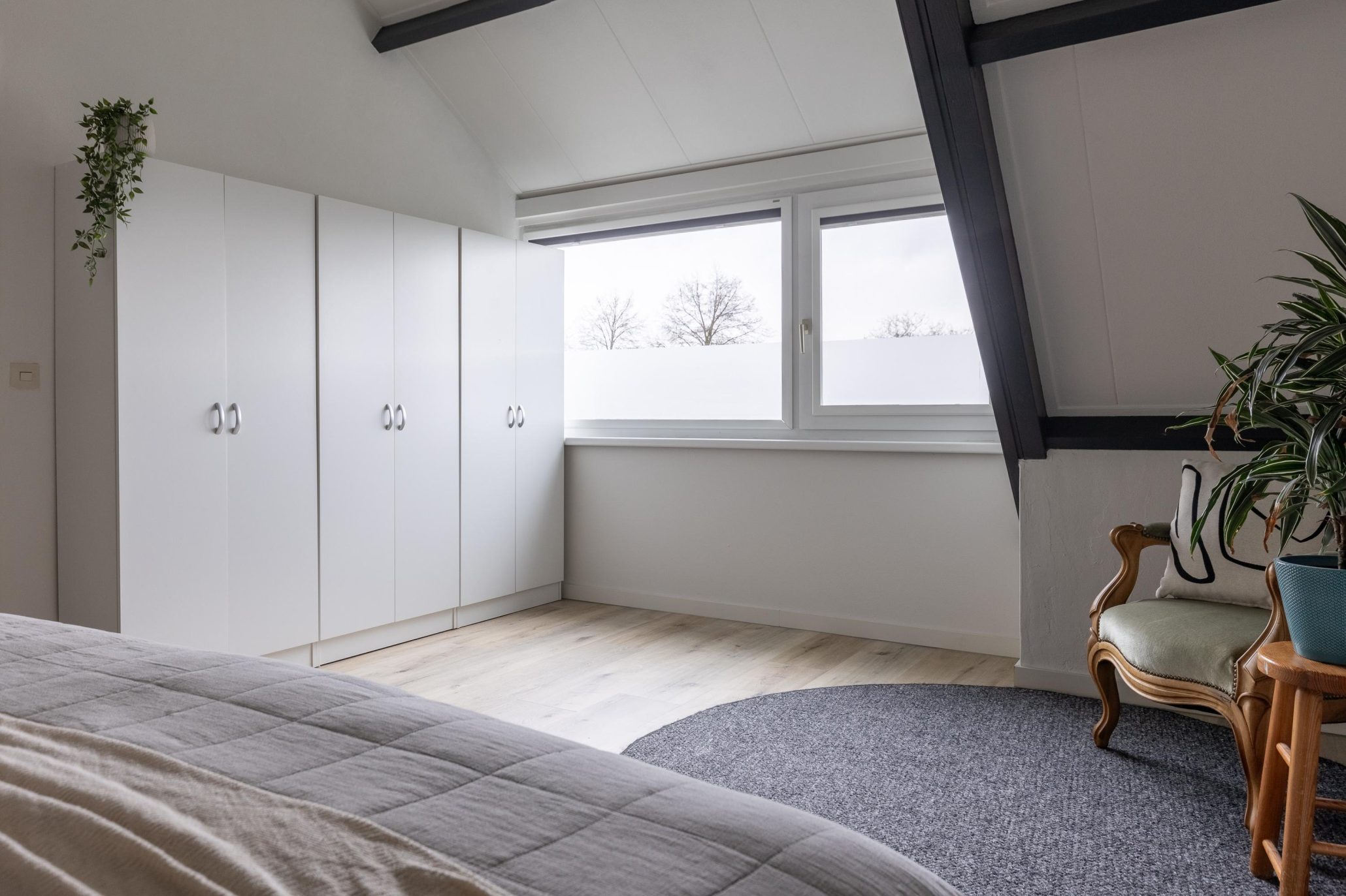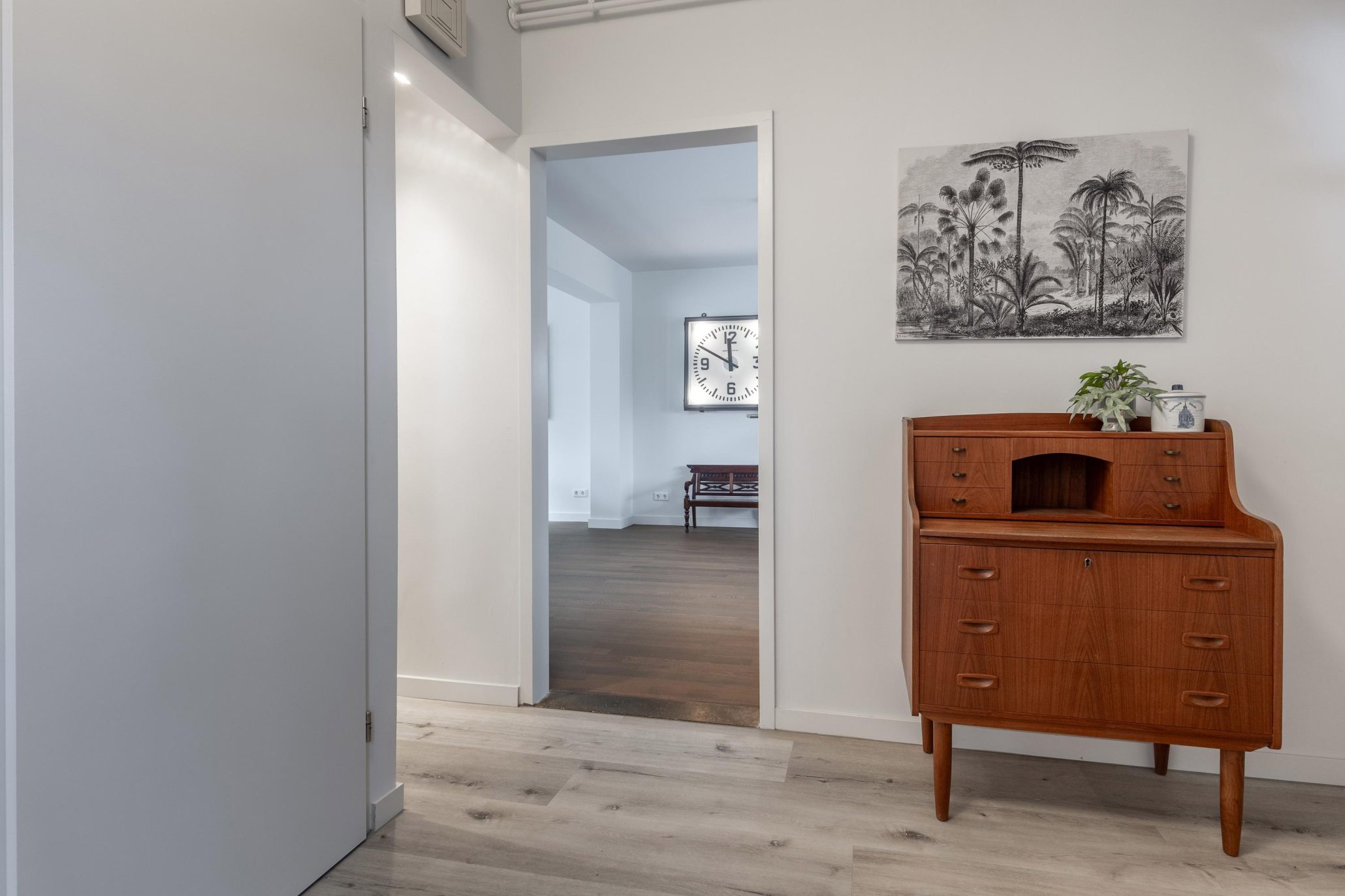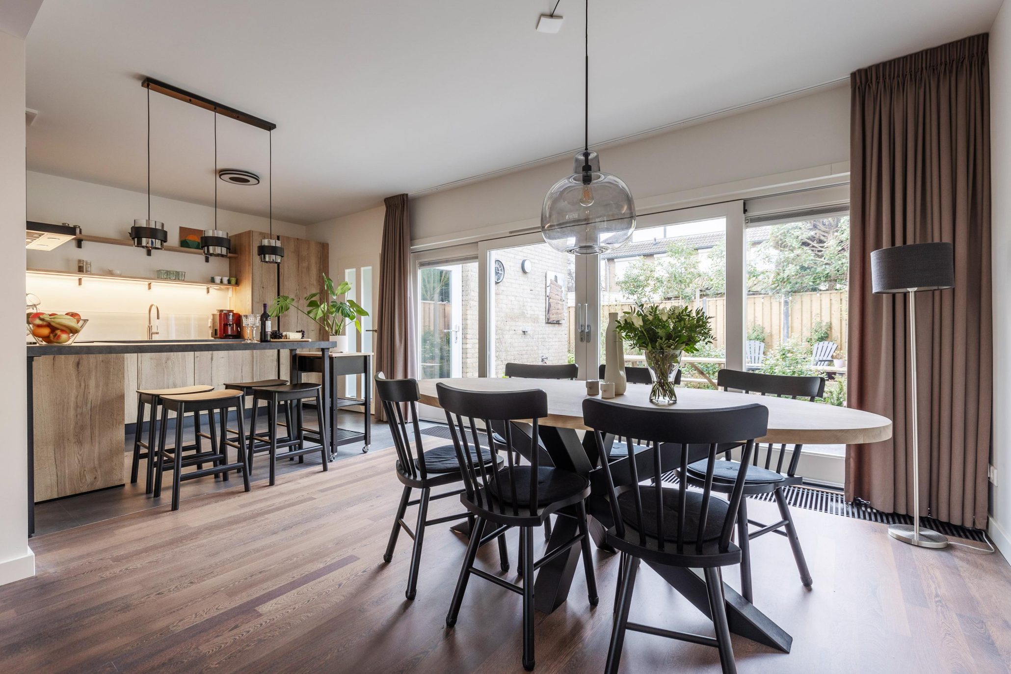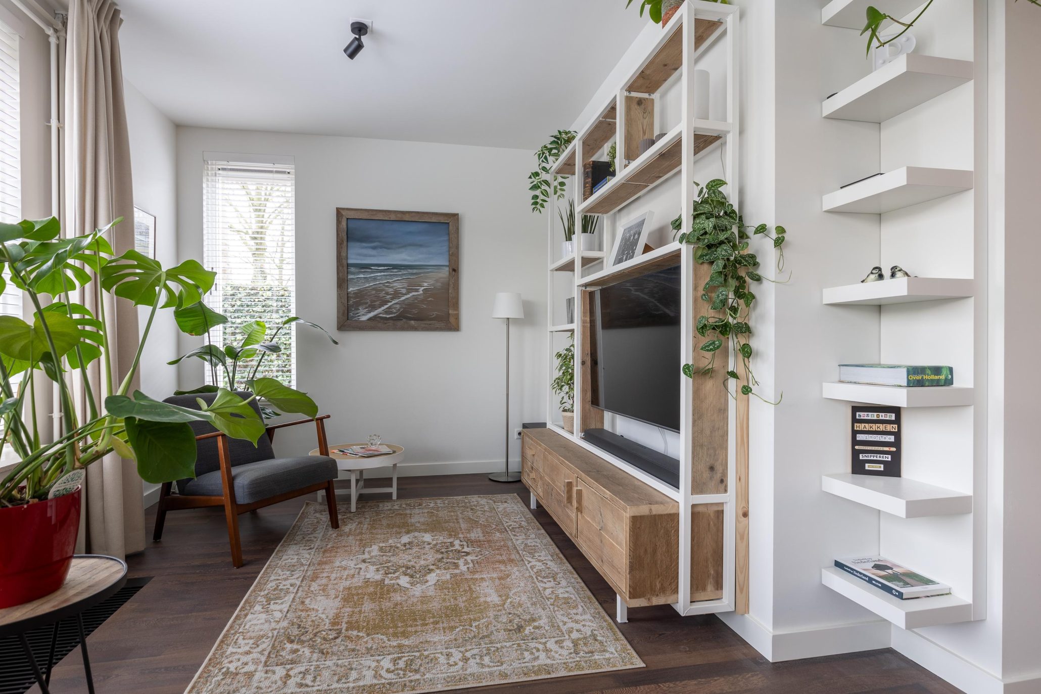 De ruime woonkamer is een heerlijke plek om te vertoeven. De sfeervolle houten parketvloer, de uitnodigende open haard en de strak gestuukte wanden zorgen samen voor een warme en elegante uitstraling. Dankzij de vele ramen