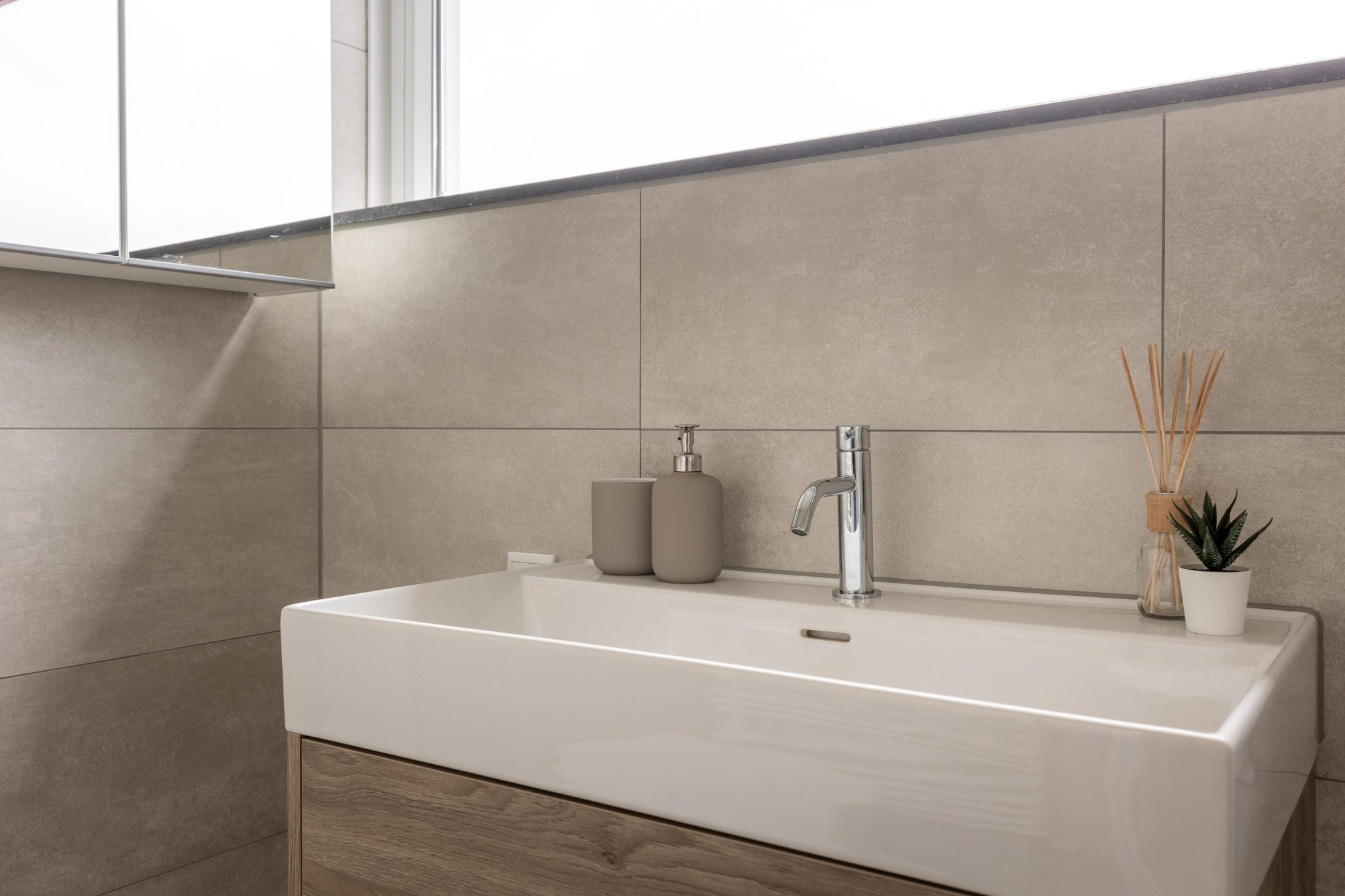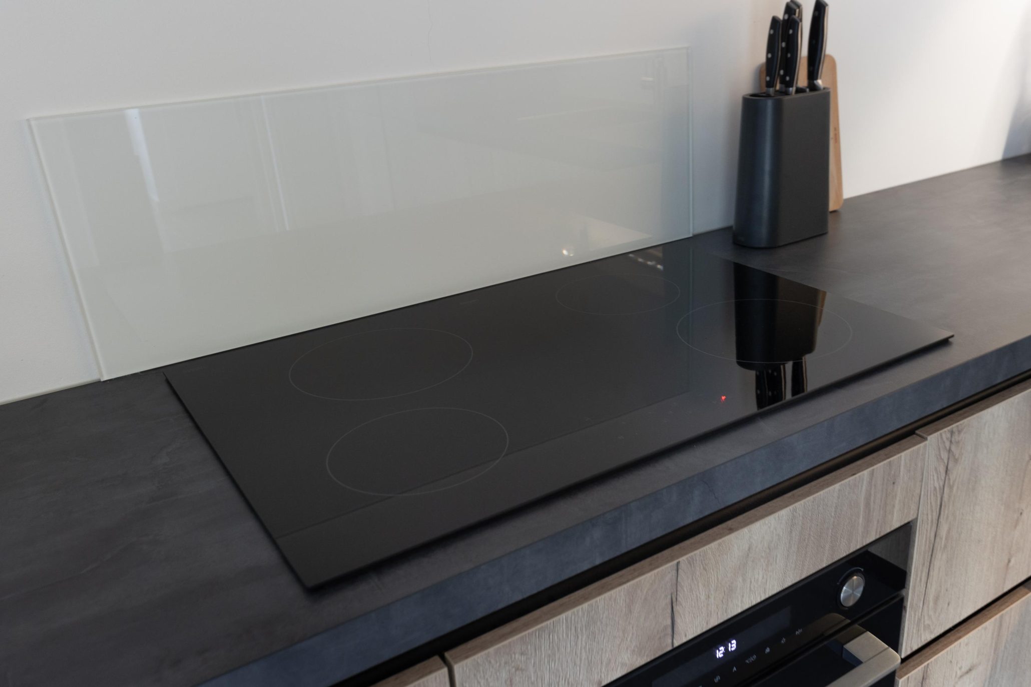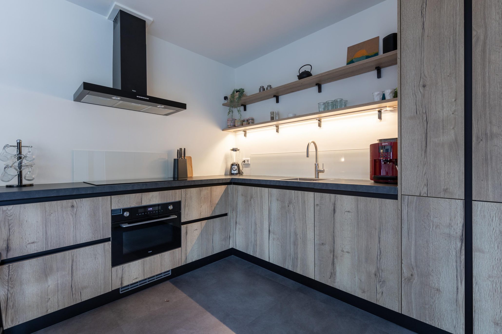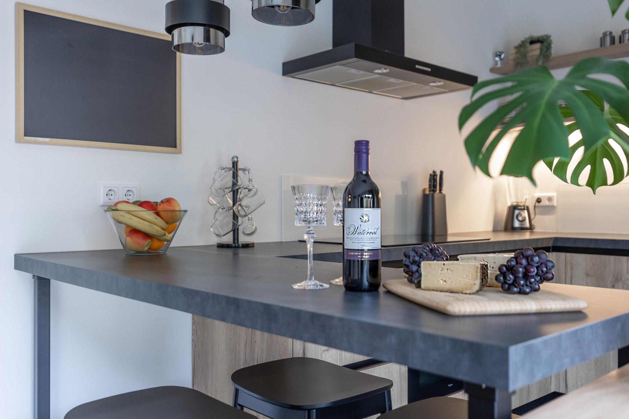 De ruime woonkamer is een heerlijke plek om te vertoeven. De sfeervolle houten parketvloer, de uitnodigende open haard en de strak gestuukte wanden zorgen samen voor een warme en elegante uitstraling. Dankzij de vele ramen